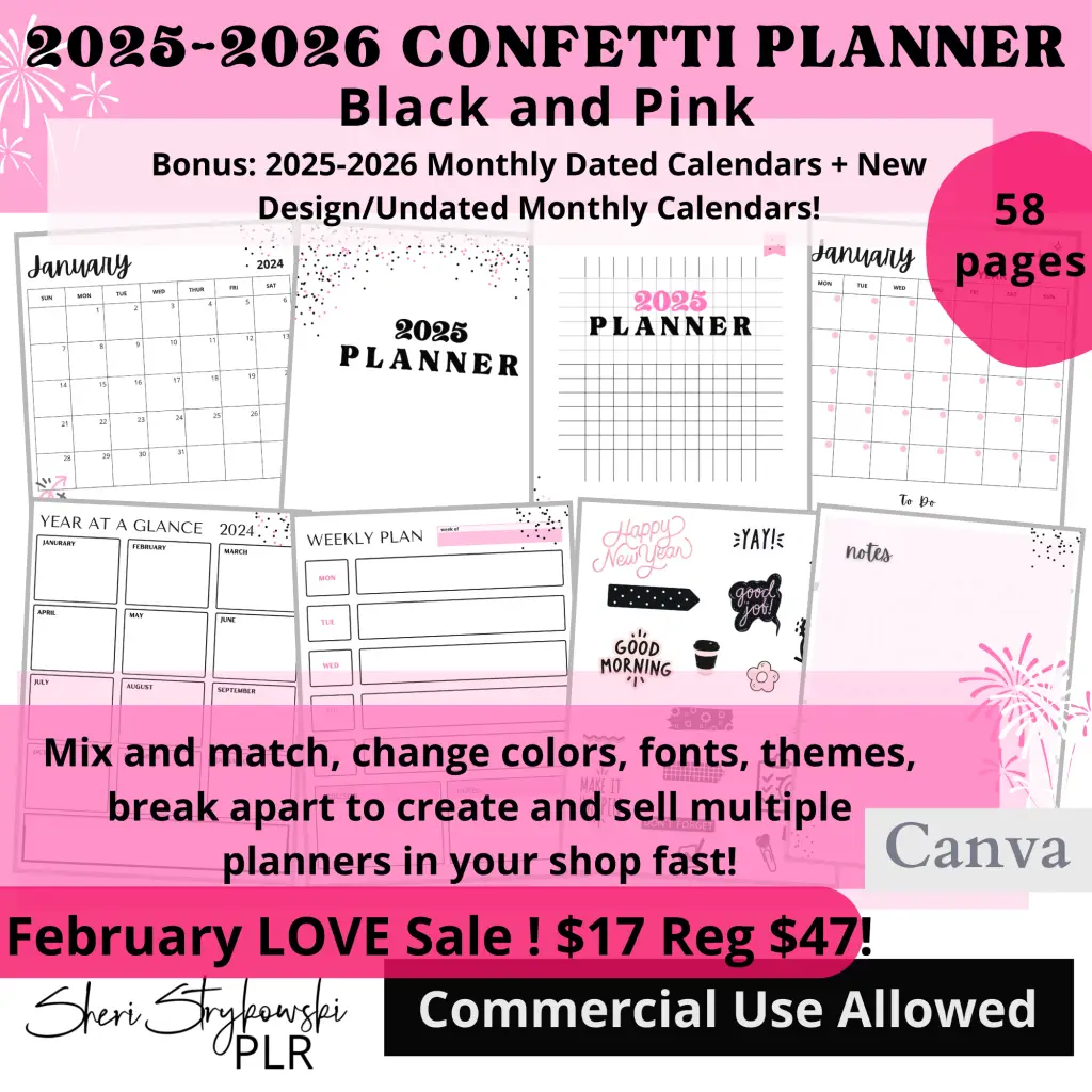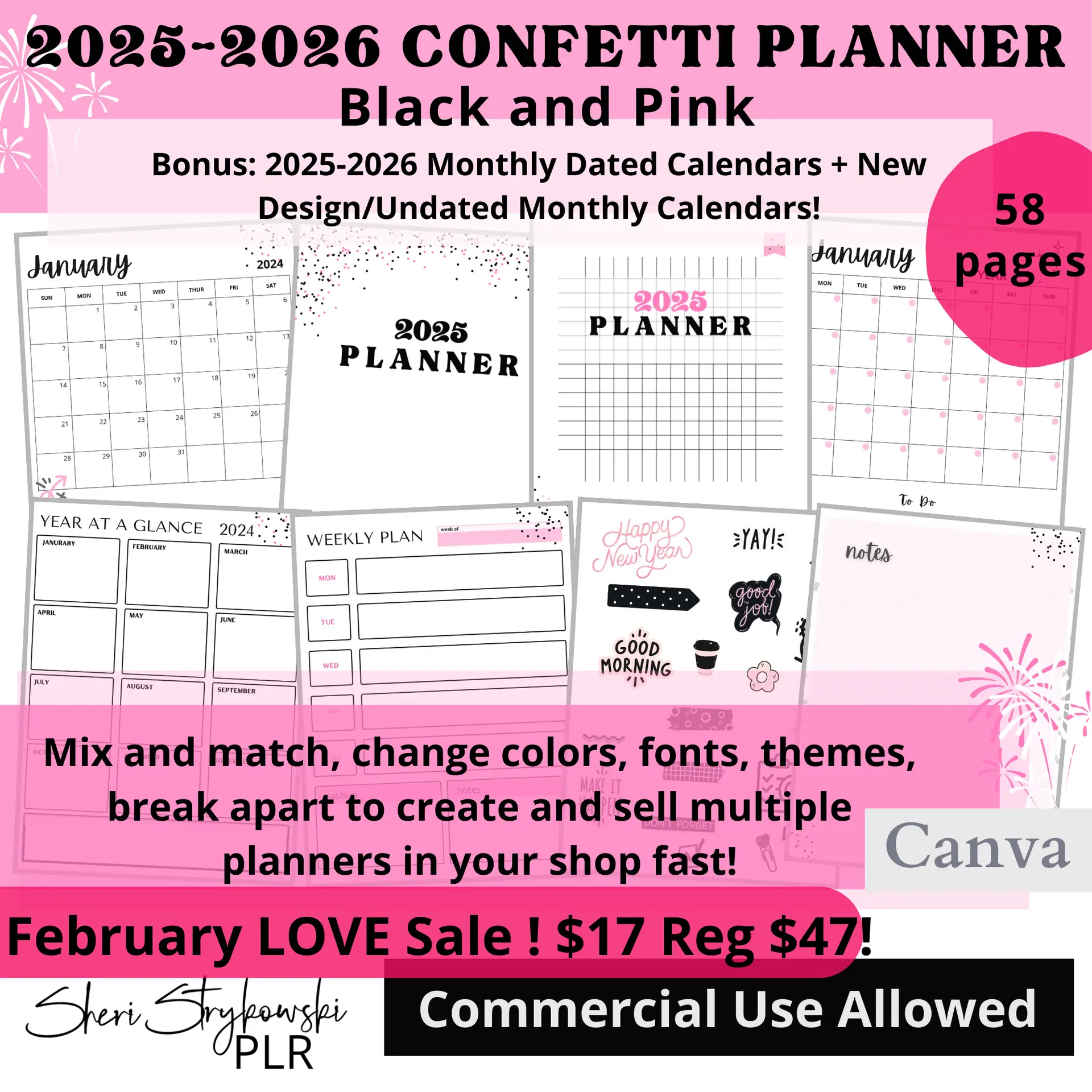 2025 -2026 Black and Pink Confetti Planner – PLR – February Love Sale $17!
