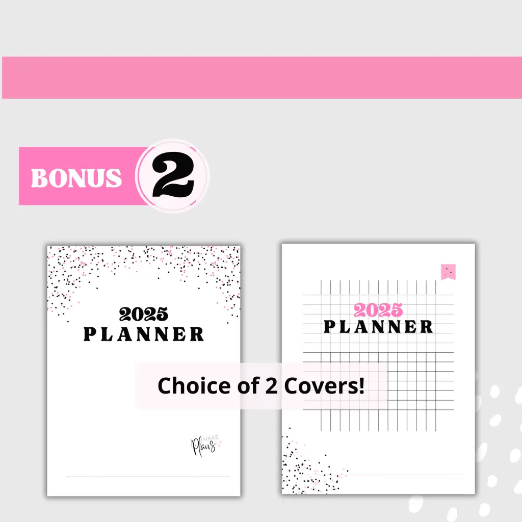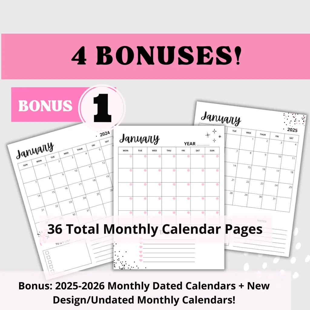 -> Bonuses include: 2025 and 2026 monthly dated calendars plus 12 more undated monthly calendars in a new design, two cover choices, cute matching stickers and a design style board template.